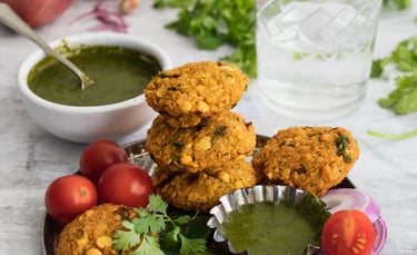 Tortitas fritas de lentejas hechas con harina de garbanzos, cilantro, semillas de hinojo y especias indias, servidas con chutney de menta.
